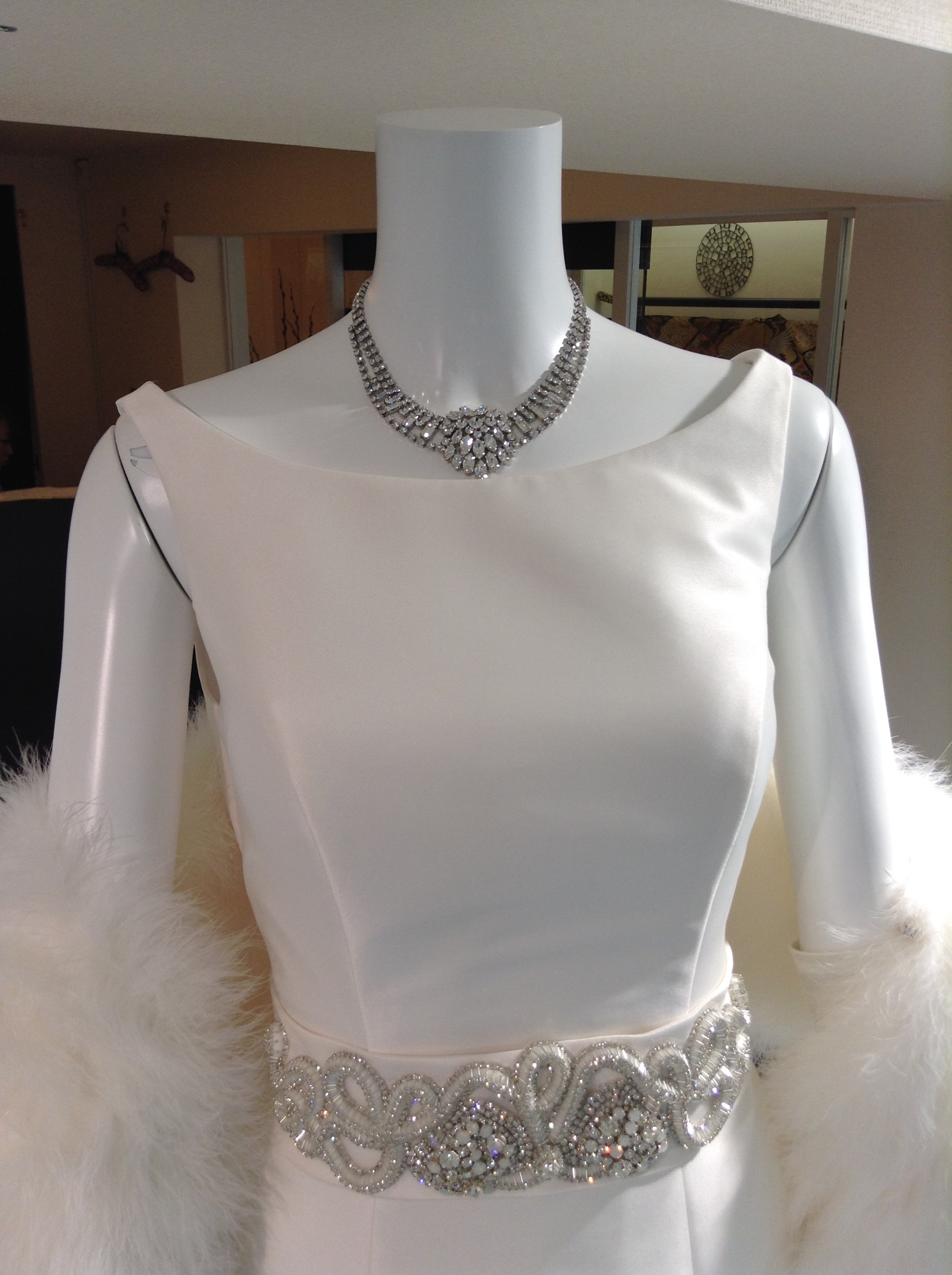 ウエストのビジューベルトと揃えたシルバーのアクセサリーをつけることによって、より一層洗練された雰囲気になります。