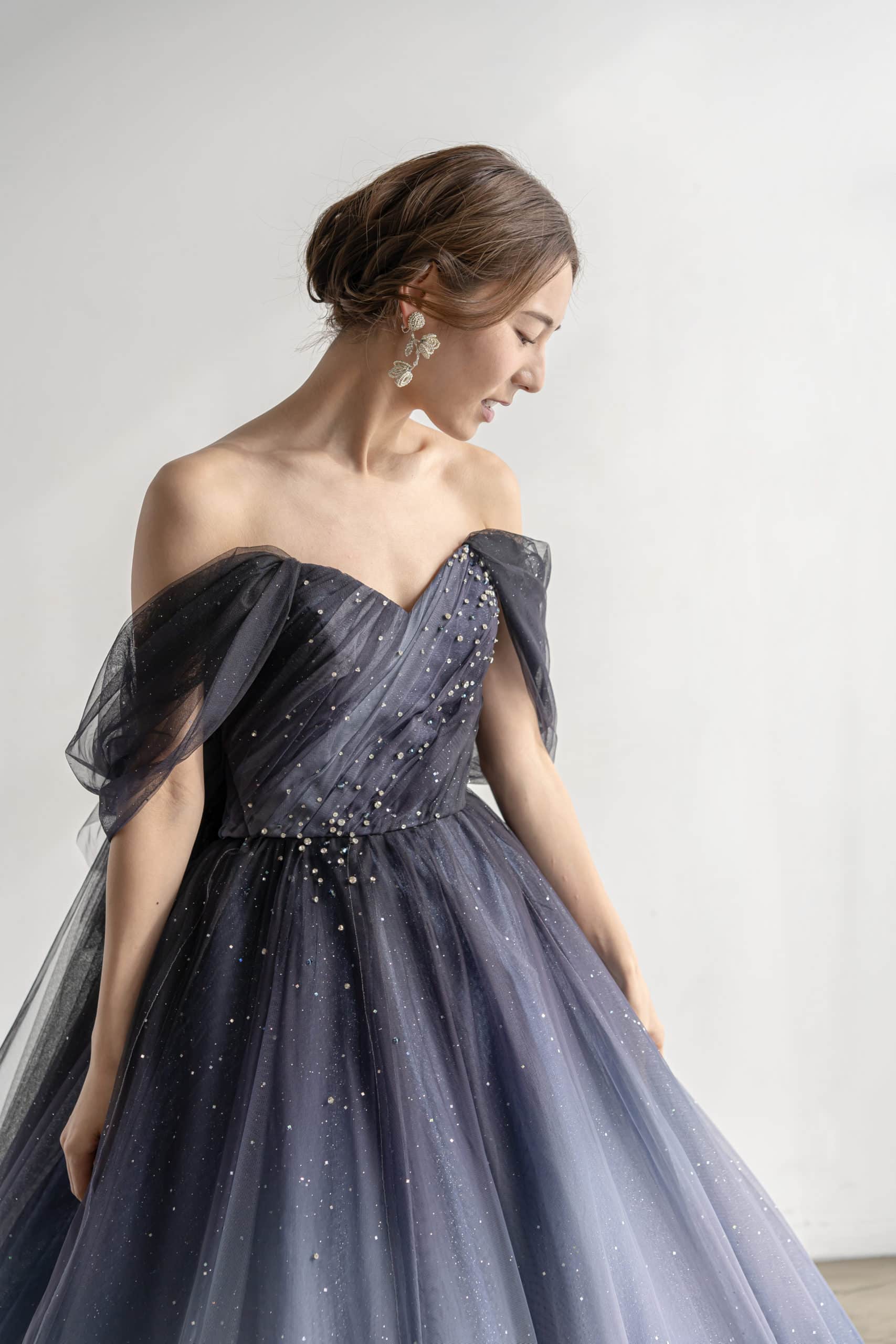 ふんわりと腕にかかるドロップショルダーのチュールが、気になる二の腕をカバーしつつ、デコルテラインを驚くほど華奢に、美しく引き立てます。