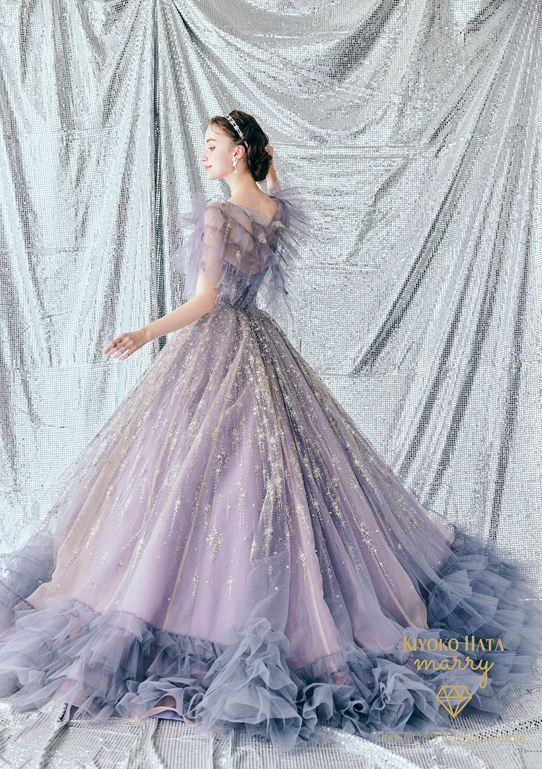 トレンドのグレイッシュパープルは、肌の透明感を引き立てる絶妙なニュアンスカラー。スカート裾にあしらわれたボリューミーなティアードフリルが、立ち姿にはドラマティックな重厚感を、お座りショットにはお花に囲まれているような可愛らしさを演出します。