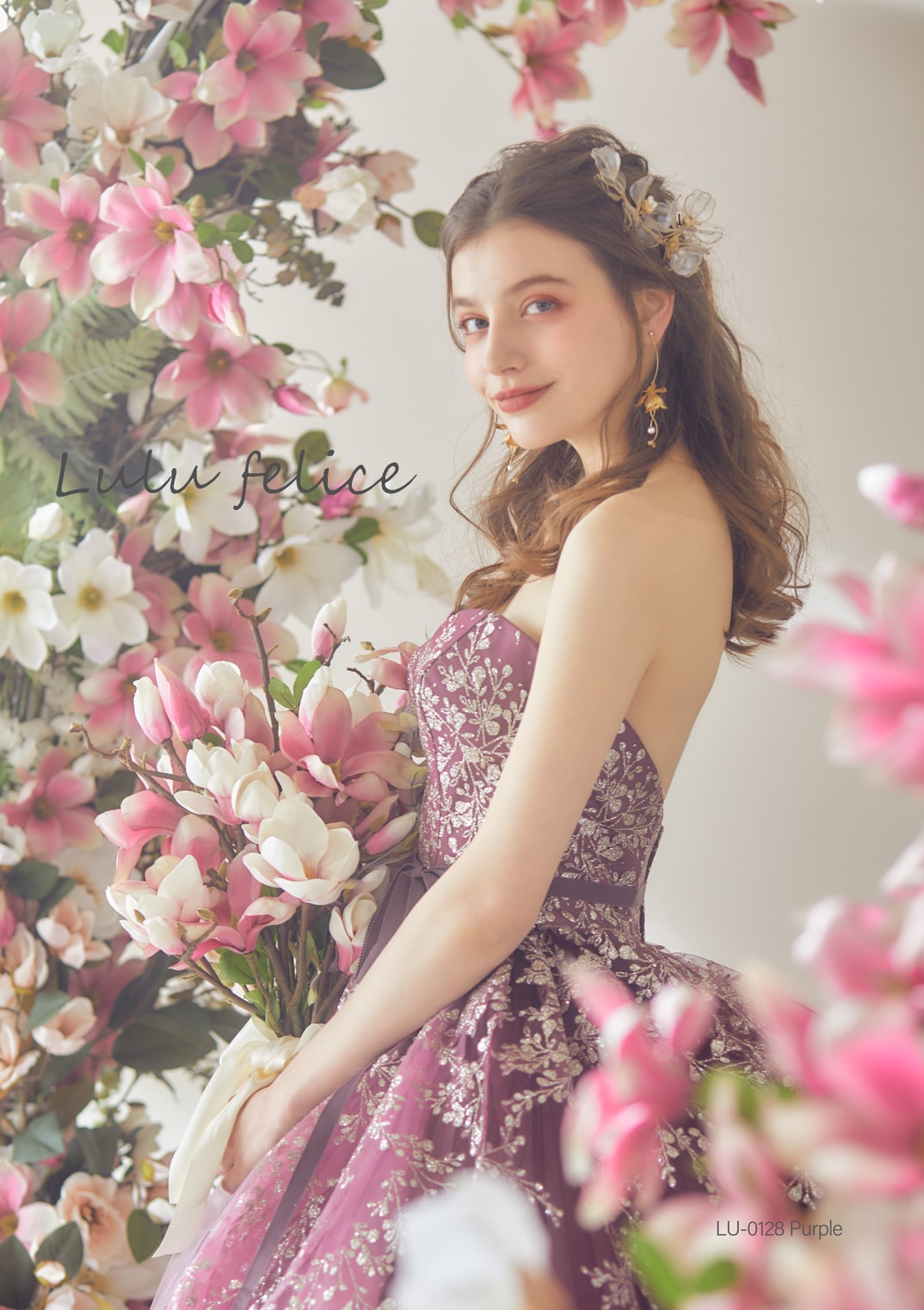前面に非常に繊細なゴールド刺繍が施され、その煌めきがパープルの深みをより一層引き立てます。ウエストには、深紫のリボン。ボリュームたっぷりのチュールスカートが、歩くたびに優雅に揺れ、ゲストを幻想的な世界観へと誘います。