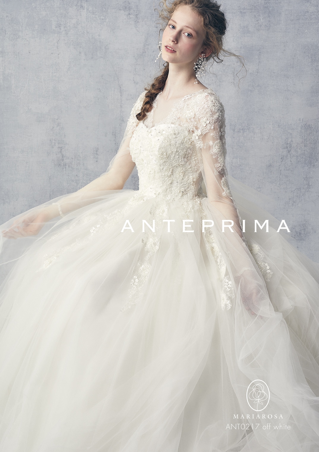 アンテプリマらしい繊細なフラワーモチーフが、ビスチェを可憐に彩るウェディングドレス。