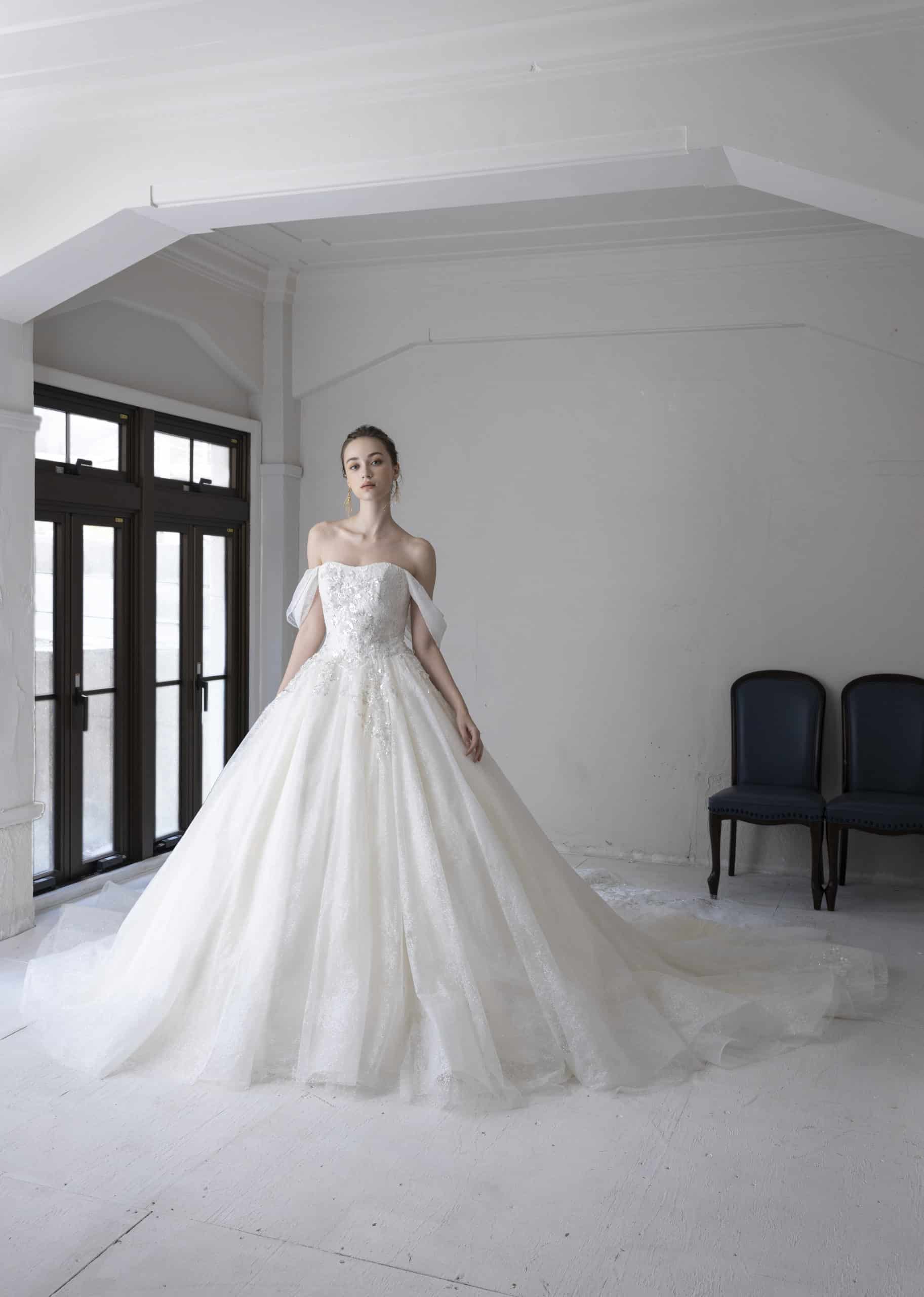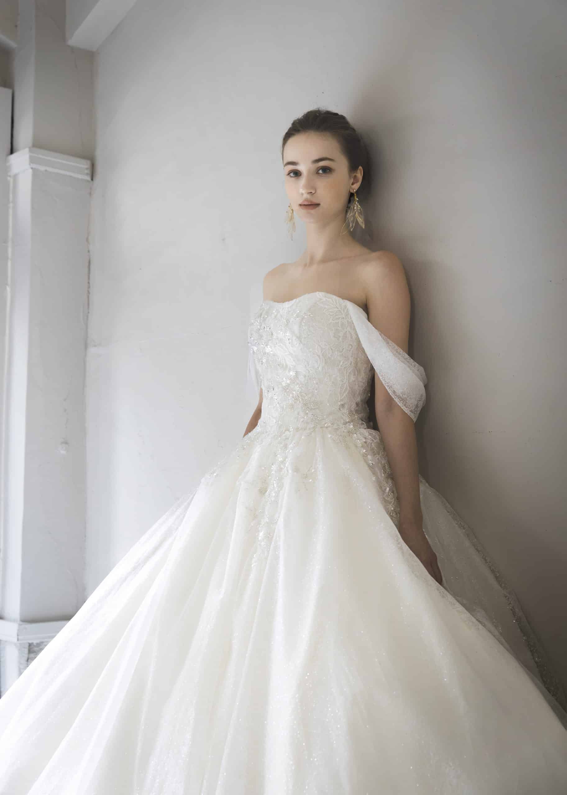 デコルテを美しく見せるハートシェイプの胸元と、二の腕を優しく包むシアーなオフショルダーのデザインです。