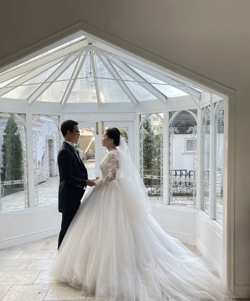 チャペル内のガラス越しにはおしゃれな街並みが見え、雰囲気のあるお写真を残すことが出来ます。