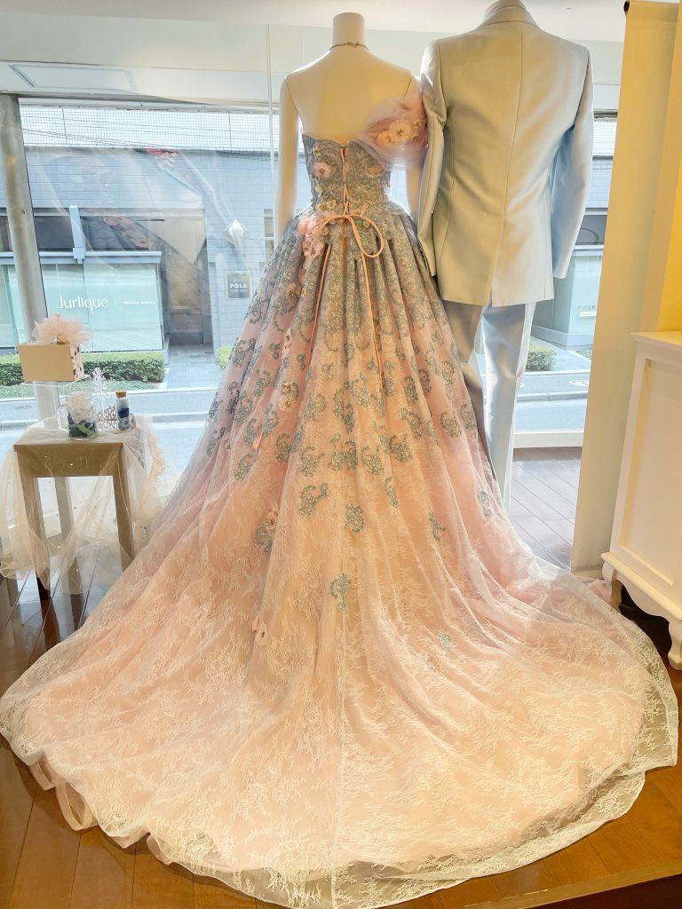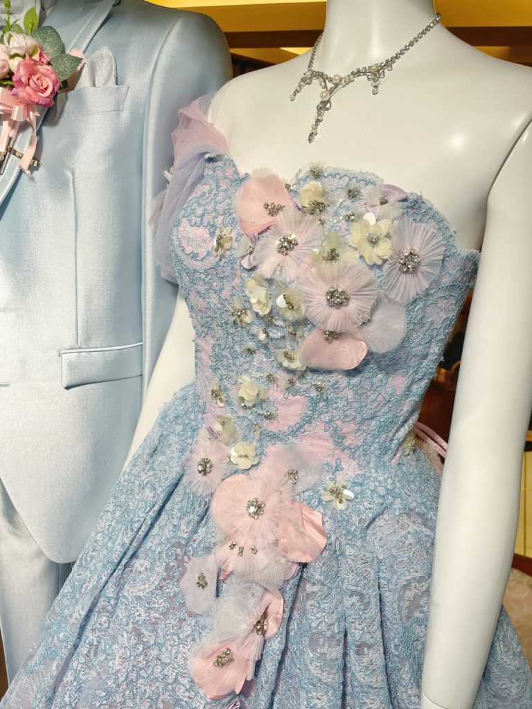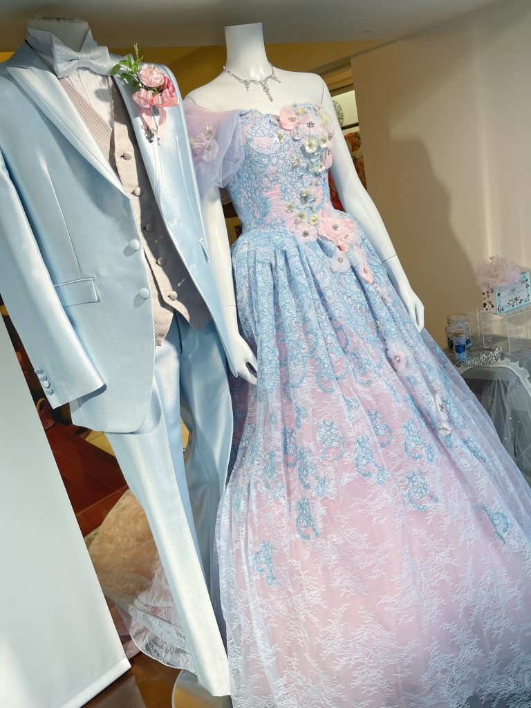 タキシードは上下水色でパンチは強めですが、色がリンクしたカラードレスがとなりに並ぶと悪目立ちせずしっくりきます!